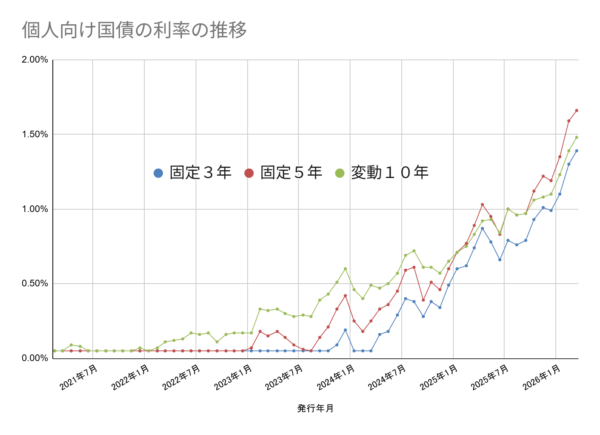 個人向け国債の利率が上がっているとよく聞く今日この頃ですが、過去の利率を調べてもパッと出てこなかったのでわかりやすくグラフにしてみました。