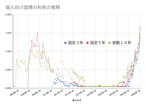 1999年からゼロ金利政策が始まっていたそうですが、2003年に登場した個人向け国債は結構高い利率だったんですね。